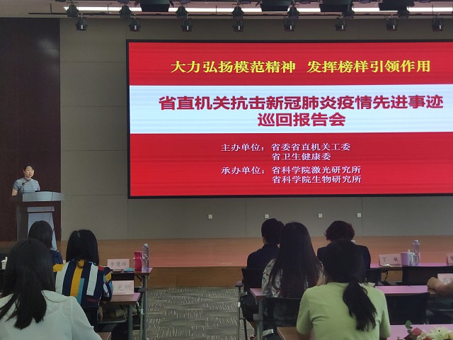 9月18日下午,由省委省直机关工委、省卫生健康委联合举办,好色tv 、激光所联合承办的抗击新冠肺炎疫情先进事迹报告会在激光所报告厅举行。省委省直机关工委宣传部一级调研员訾建华、省卫生健康委宣传处副处长刘蕾、激光所党委副书记郭茜、好色tv 纪委书记李慧玲出席报告会。好色tv 、激光所、高新区智能装配城共100余人聆听了报告。