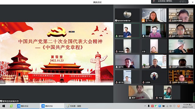为学习宣传贯彻党的二十大精神,2022年11月23日,学部党委委员夏雪奎同志以“中国共产党第二十次全国代表大会精神—关于《中国共产党章程》(以下简称《党章》)的修改”为题,通过线上党课的形式,和药物筛选党支部一起学习和领悟了《党章》修改的宗旨和精神。