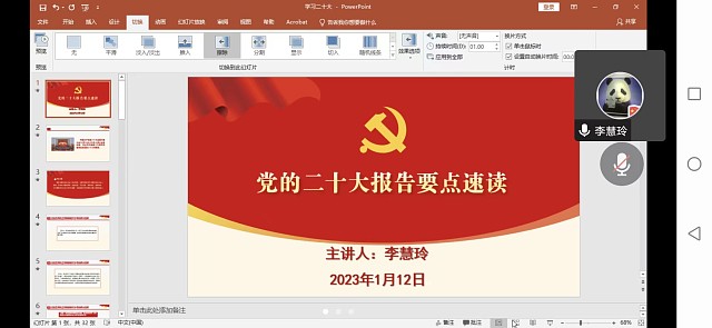 为进一步增强教职员工对党的二十大精神实质的认识,准确把握党的二十大重大意义和丰富内涵,推动党的二十大精神走深走实,2023年01月12日,学部党委副书记兼纪委书记李慧玲同志以“党的二十大报告要点速读”为题,为分析生化党支部上了一堂生动的线上专题党课。